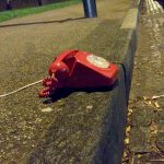 Two, bright red, old style landline telephones which are connected. We place them on two street benches round the corner from each other.