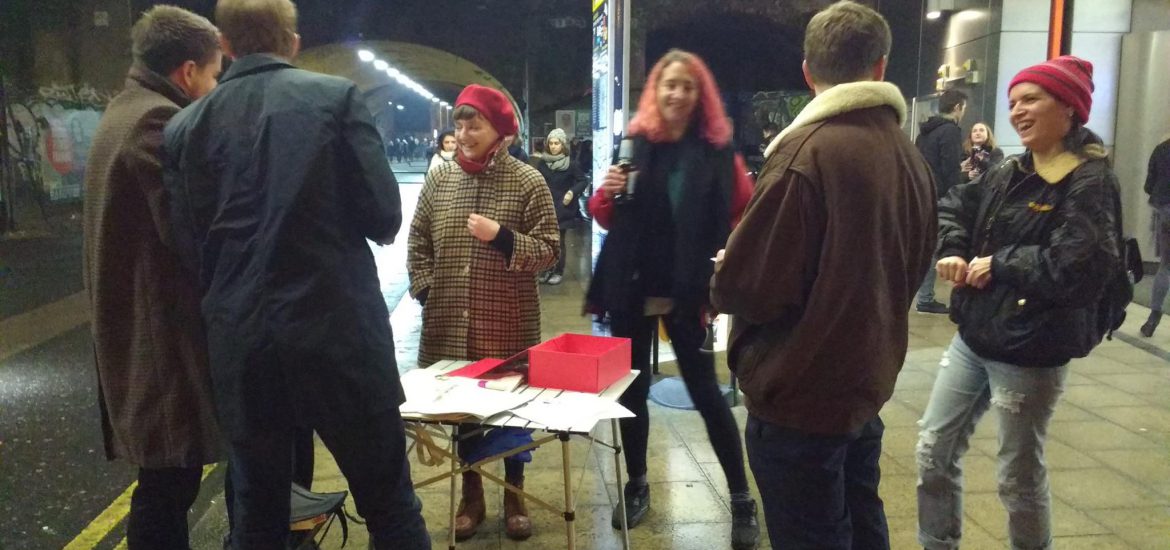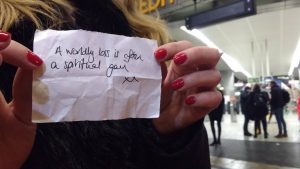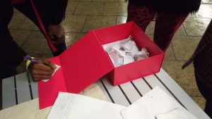 The Thought Exchange made it’s first outing last Saturday night. People just wrote a short thought on a scrap of paper, put it in the box, and picked out another stranger’s thought. In this simple, but mystical way, strangers share sentiments…